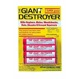 This effective Gas Bomb rapidly kills any tunneling or burrowing animal when dropped underground. Pack of four. U.S.A. Removal Of: Burrowing rodents, Indoor/Outdoor Use: Outdoor, Dimensions L x W x H (in.): 9 x 6 x 1